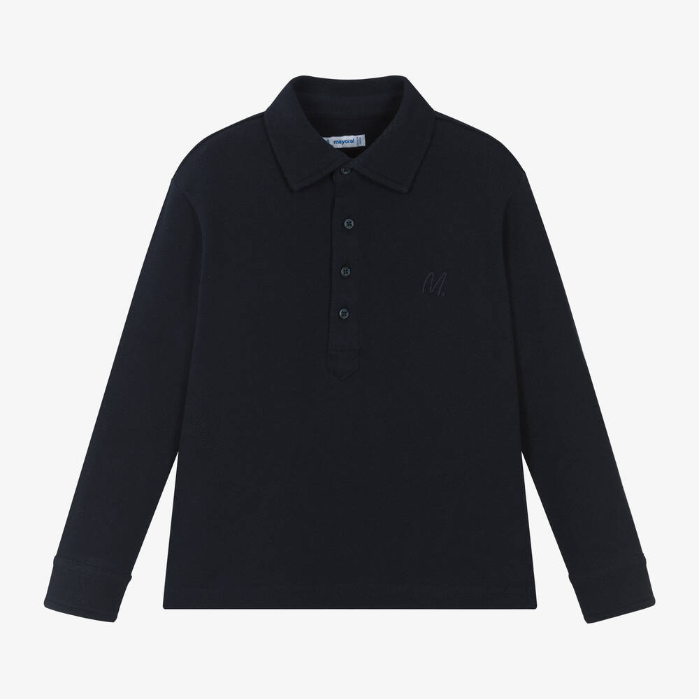 Navy blue long-sleeved polo shirt for boys by Mayoral, made in soft cotton piqué. This everyday style has button fastenings on the front and cuffs, with a tonal 'M' embroidered on the chest for a discreet, branded sign off.