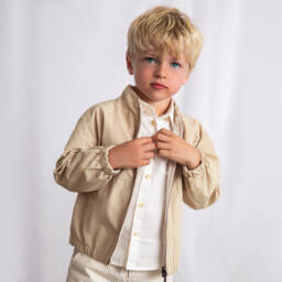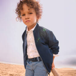 Stylish, lightweight and reversible blouson jacket for boys by Mayoral, with two versatile looks. One side is made in a pale blue cotton and linen blend with a slubbed effect. It has a small logo badge on the chest for a subtle designer touch, whilst the other side is silky and navy blue. Both sides have useful front pockets, elasticated trims and a zip fastening.