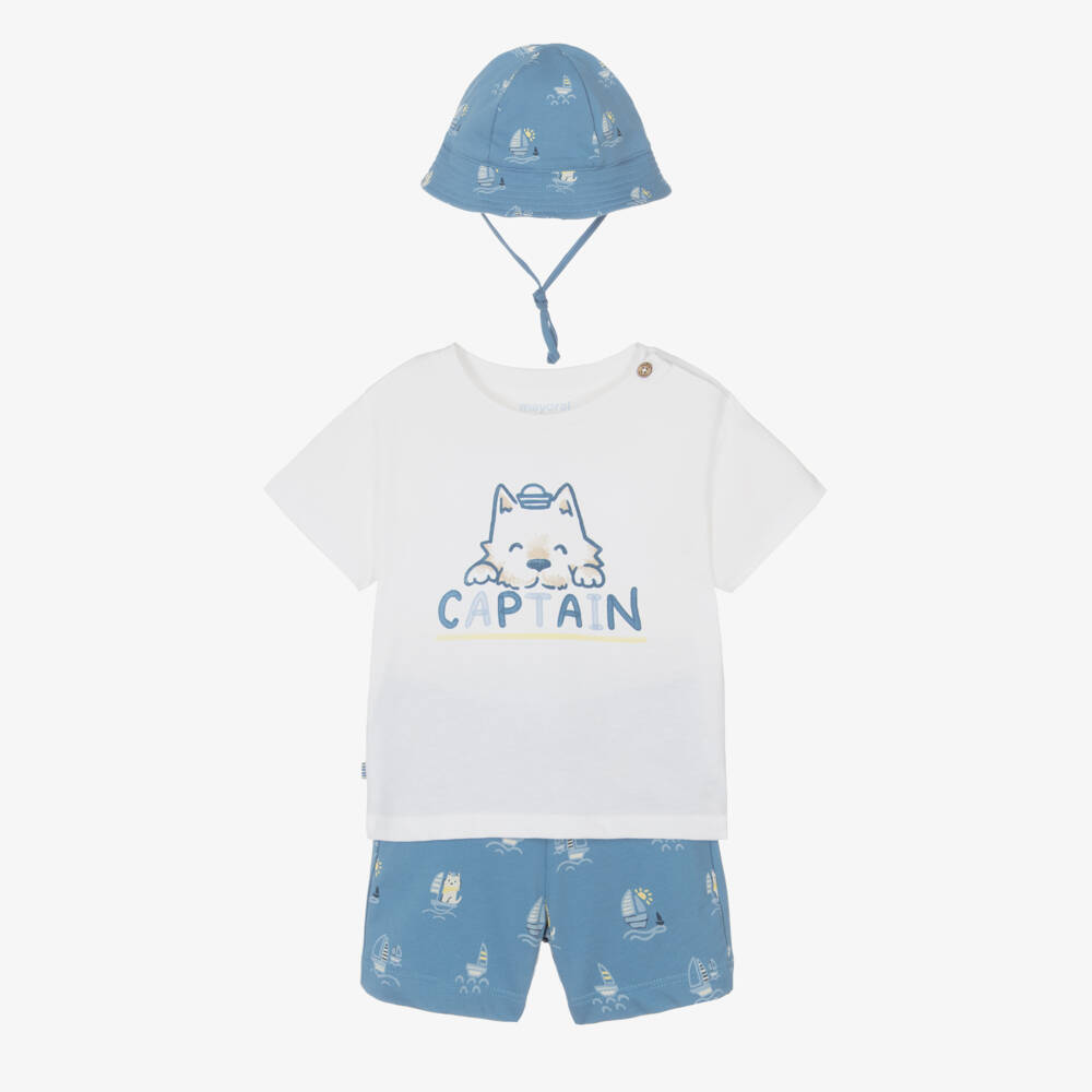 Blue and white shorts set for younger boys by Mayoral, made in comfortable cotton jersey. The short-sleeved T-shirt has a captain dog print on the front and useful fastenings on one shoulder. The paired shorts have an all-over sailboat print and an easy drawstring waist. A matching jersey sun hat ties securely under the chin for a complete look.