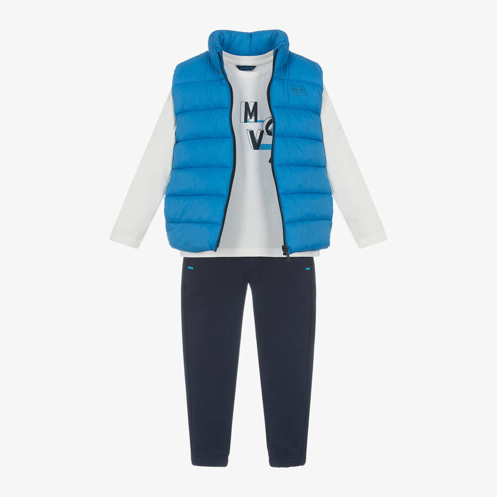 Casually styled, this blue trouser set for boys is by Mayoral. Smooth with a silky lining, the lightly padded high-neck gilet fastens with a zip on the front and has a 'Let's Move' motif on the chest. Made from soft cotton jersey, the ivory long-sleeved top is printed with a bold 'Move' design. A pair of navy blue cotton-blend joggers complete this laid-back look. They have a cosy fleecy interior, extra durable knees, side seam pockets, and a comfortable drawstring waist.