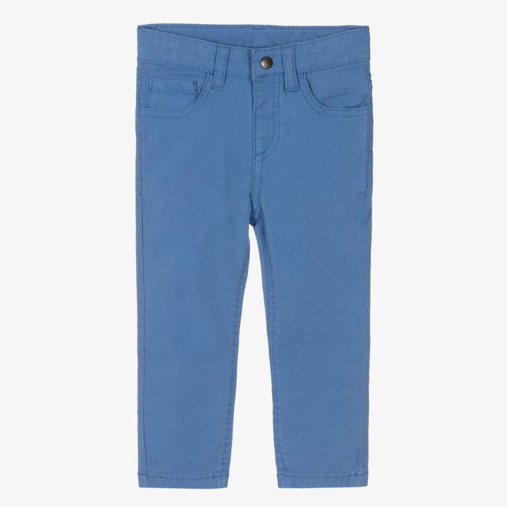 Casual blue trousers for little boys by Spanish brand Mayoral, made in soft and durable cotton twill. These slim fit trousers have a front popper fastening, classic five-pocket styling, and an adjustable waist for a comfortable, ideal fit.