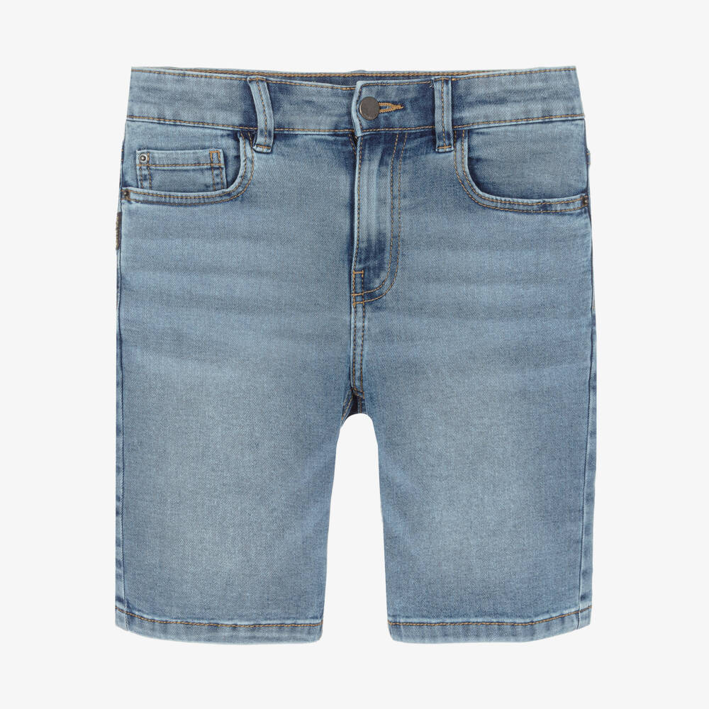 Blue sustainable cotton denim shorts for boys by Mayoral, with a washed and worn look. Bermuda length, with five pocket styling, they have a useful adjustable waistband for a good fit.