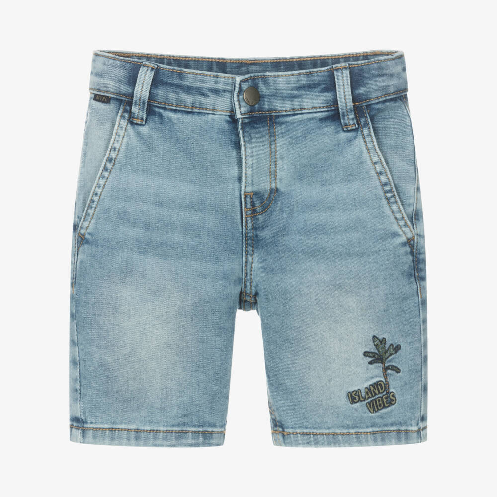 Mid-blue denim shorts for boys by Mayoral, with a slightly faded look. Easy to pair, they have a green logo patch on the back and an embroidered green palm tree on the front. They do not compromise on fit and comfort, with an internal adjustable waist.