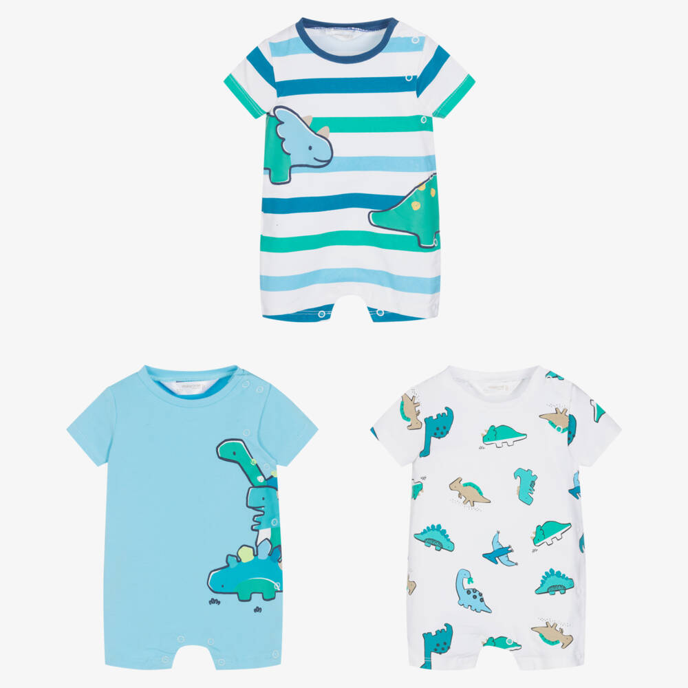 Pack of three sky blue and white shorties for baby boys from Spanish designer Mayoral. They are made in soft and stretchy sustainable cotton jersey, with adorable happy dinosaur motifs and striped designs. These short-sleeved babysuits fasten with poppers on the front, running from the neckline to between the legs for a super quick and easy dressing routine.