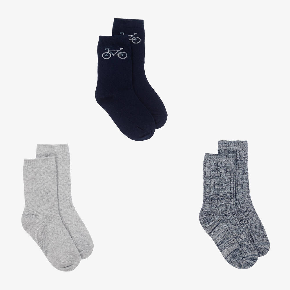 Pack of three pairs of navy blue and grey socks for boys by Spanish brand, Mayoral. Made in a soft cotton blend, two pairs have a patterned knit, whilst the navy pair has jacquard bicycles on the cuffs. These socks contain organic cotton.