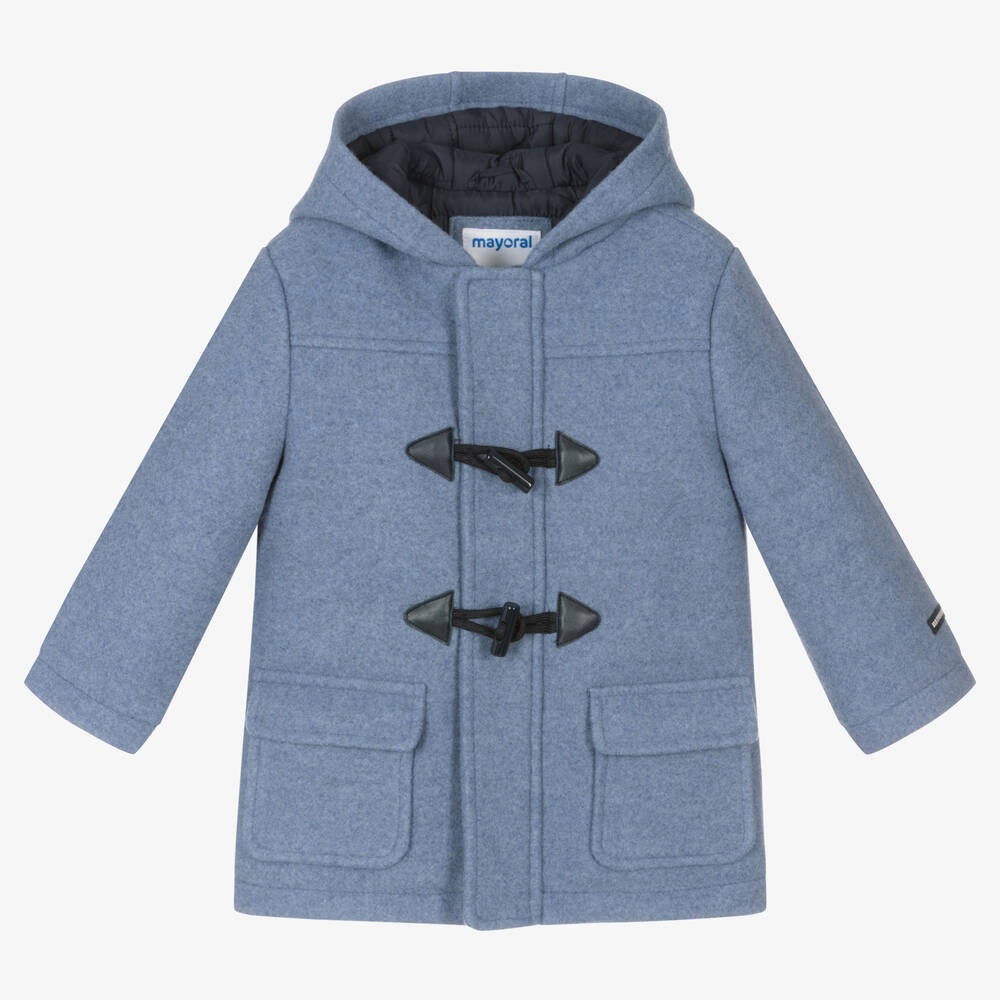 Dusky blue duffle coat for little boys by Mayoral, made from a soft felted blend. Lined with silky smooth, quilted fabric, this classic coat has traditional toggle fastenings on the front which conceal an easy zip underneath. There are flap pockets on the front and a rubberised logo patch can be seen on one sleeve for a discreet branded finish.