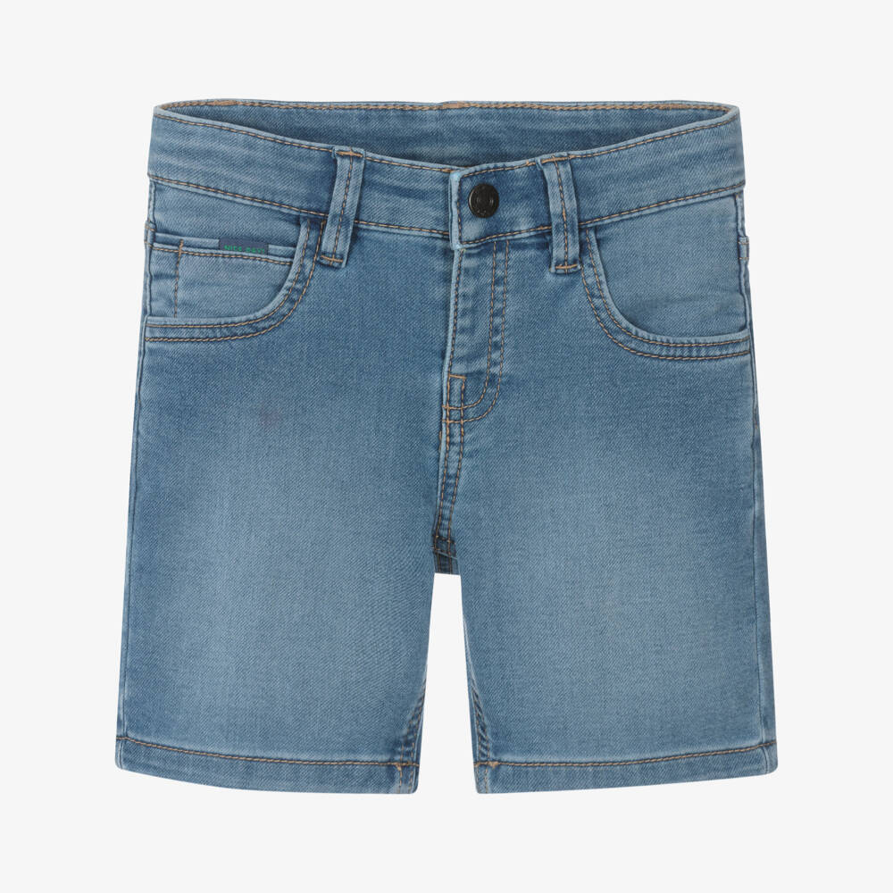 Mid-blue denim shorts for boys from Mayoral. With a stonewash effect, these comfortable shorts are made in soft and stretchy cotton-blend jersey, designed to look like denim. They have an adjustable waist for the ideal fit and an easy-to-use front popper disguised as a button. Sizes for older boys also have a zip closure on the front. They are styled with a navy blue logo patch on the back and five practical pockets.