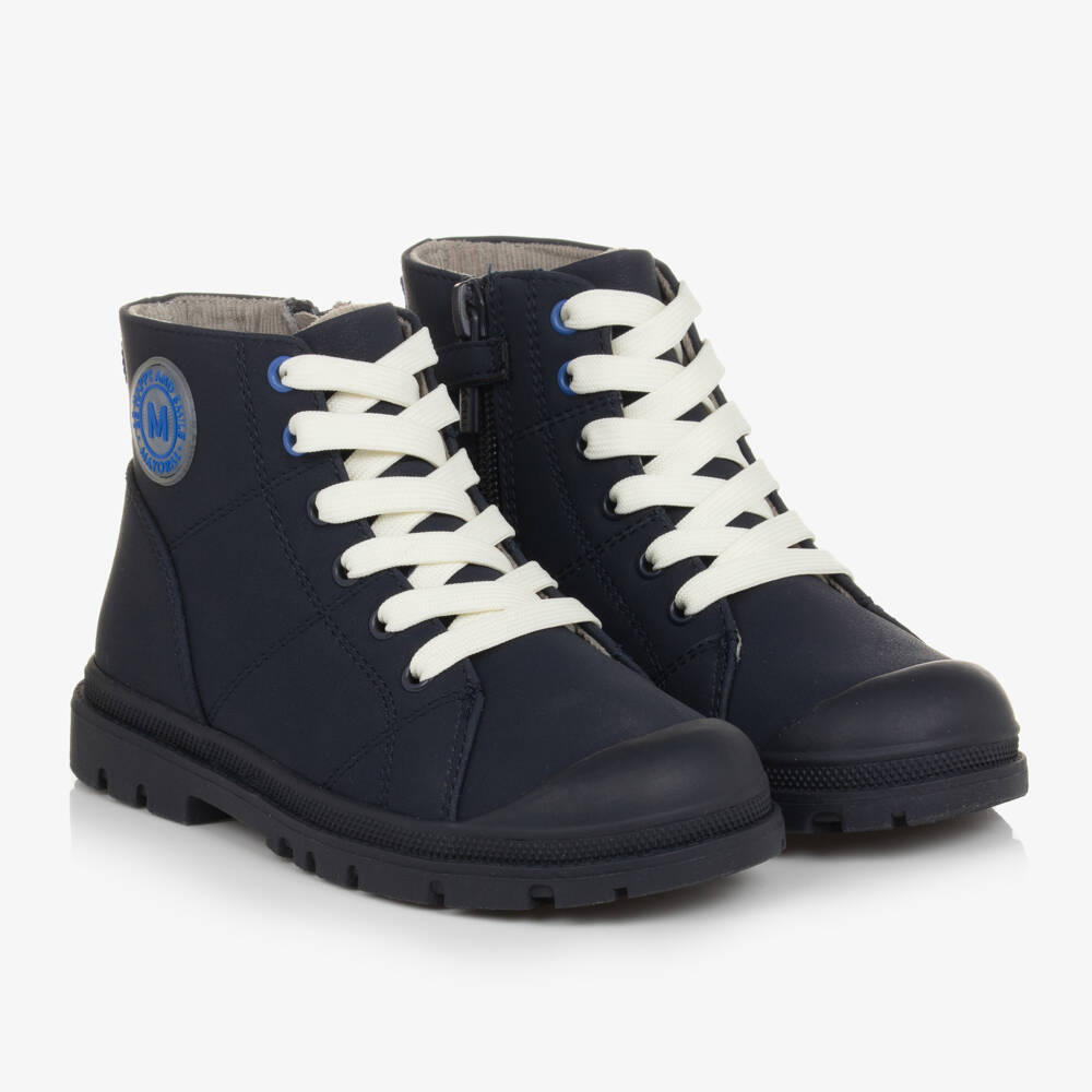 Navy blue ankle boots for boys by Spanish brand Mayoral, made in smooth faux leather, with a rubberised ivory logo badge and overstitch detailing on the sides. They fasten with laces and a side zip, secured with an ivory velcro tab, and have an ivory pull tab on the ankle. They are lined in soft cotton corduroy and have a sturdy, ivory toe cap and outer, non-slip sole in rubber. Included is a second pair of blue laces, allowing for a different look.