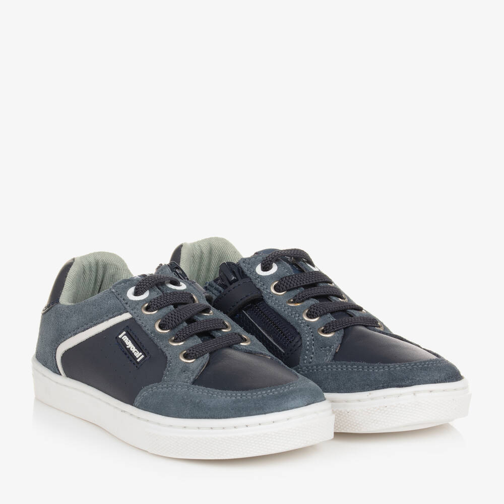 Navy blue trainers for boys by Spanish brand Mayoral. They are made in smooth leather, with grey-blue suede trims and logo detailing. Antibacterial and breathable, these comfortable shoes are lined in soft cotton fabric, with a removable insole and non-slip rubber soles. There are elasticated laces for easy pull-on, with a zip and velcro tab for quick fastening.
