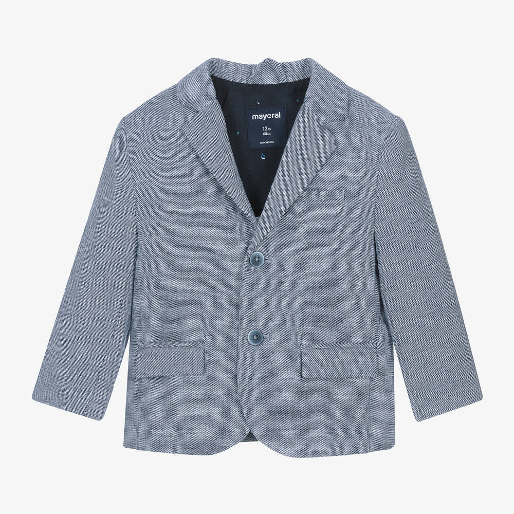 Smart navy blue marl blazer for little boys by Mayoral, woven in a soft cotton and linen blend. This single breasted style has a partial lining for added comfort, patterned in sweet little sailboats. There are front flap pockets and a faux chest pocket, with a vent on the back for ease of movement.