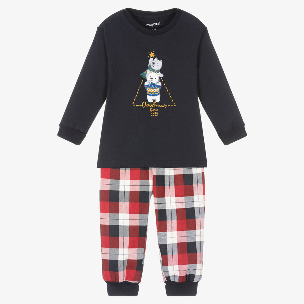 Navy blue and red pyjamas for little boys by Mayoral, made in soft and stretchy cotton jersey. The long-sleeved top has popper fastenings on one shoulder for easier dressing and snug ribbed cuffs which can be turned up or down. There is a festive print on the front with a 'Christmas Time' slogan below. Comfortable for lounging, the tartan trousers have stretchy cuffed ankles and a drawstring waist. A matching bag is included for neat storage.