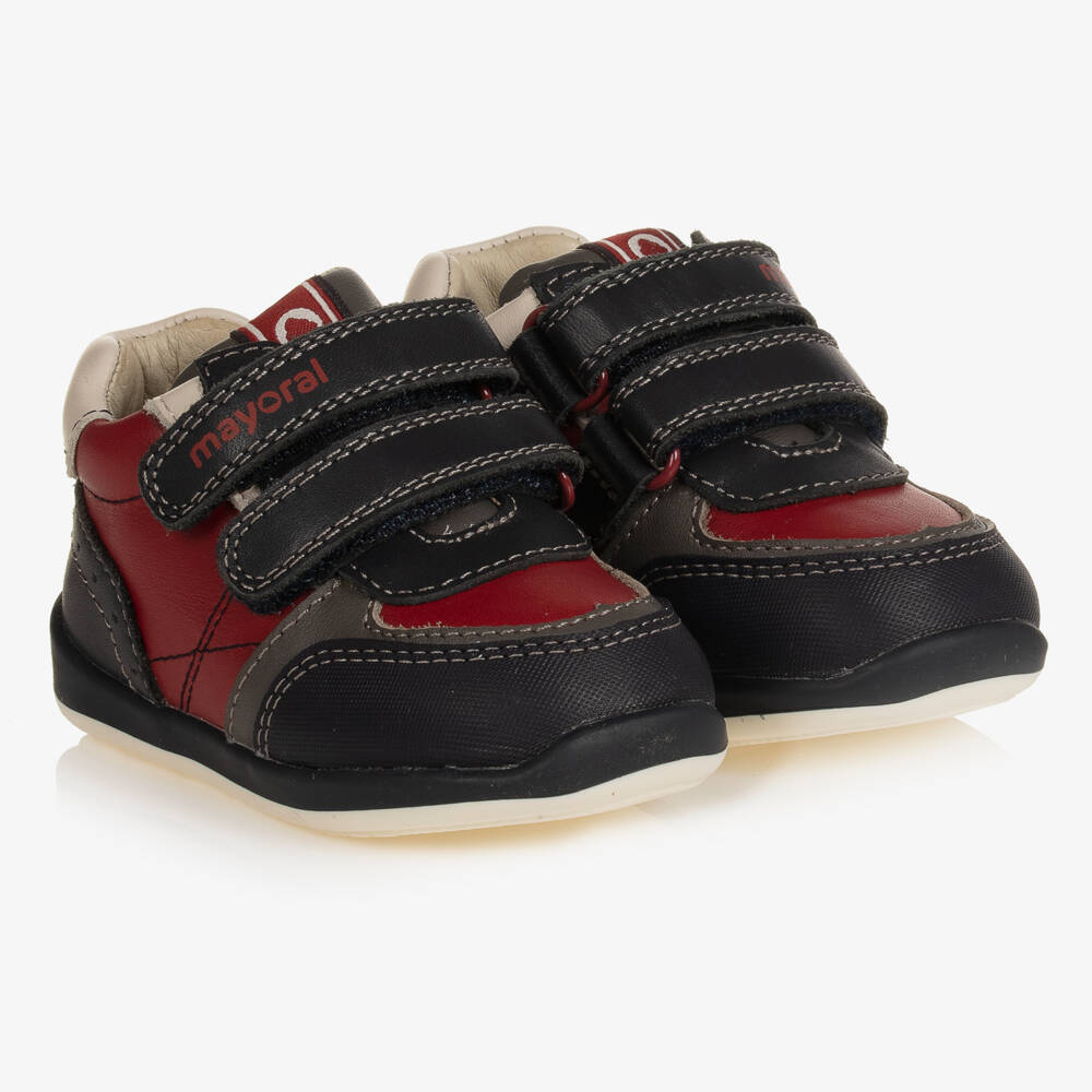 Sporty red and navy blue leather first walker trainers from Mayoral, with velcro fastening straps. The uppers comprise contrasting panels red and blue panels, with logo prints. The leather lining provides supreme comfort for little feet, whilst the non-slip rubber sole ensures grip.