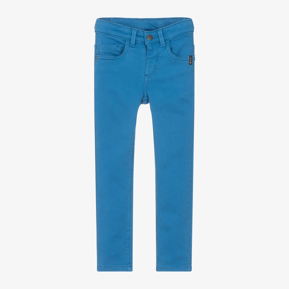 Bright blue slim-fit jeans for boys from Mayoral, made in soft and stretchy denim with a subtle washed effect. These vibrant casual trousers have five-pocket styling with simple branding on the front and back for a modern, minimalistic look. They have an adjustable waist for a good fit and secure with a popper on the front. Larger sizes also come with zip fastening.