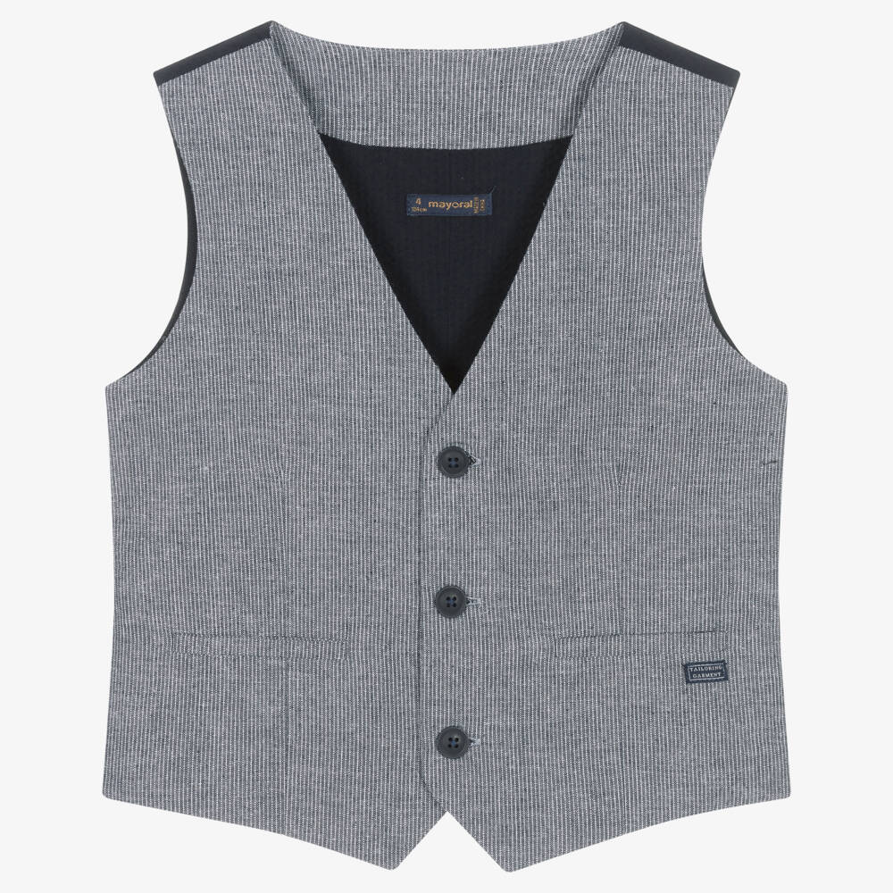 Finely striped blue waistcoat for boys by Mayoral, woven in a soft cotton and linen blend. Lightweight and comfortable to wear, this smartly tailored piece has a lightweight cotton seersucker back, with a matching lining. The front has mock horn button fastenings and welt pockets, adding a stylish finishing touch.