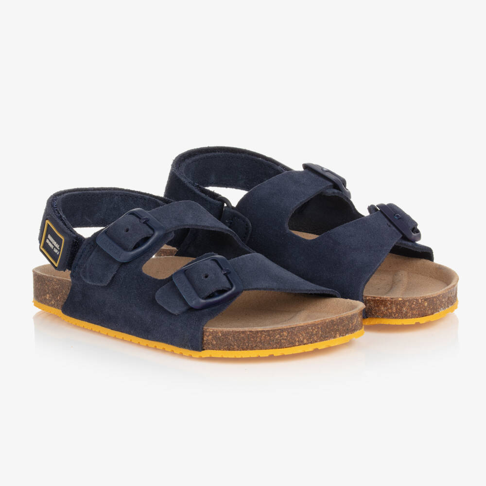 Navy blue sandals for boys by Mayoral, made with soft suede leather uppers. Ideal for warm days out, these open-toe sandals are made with comfort in mind with a soft, cork-covered footbed and two adjustable buckle fastenings across the foot. There is also a velcro strap around the back of the ankle to help keep feet secure. They are set on a sleek yellow rubber sole that provides maximum grip and stability.