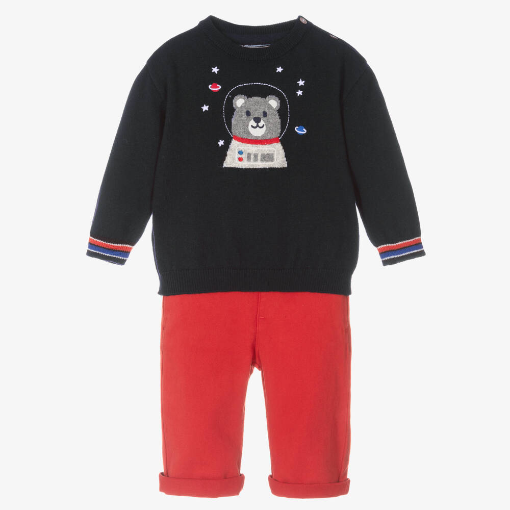 Casual and comfy top and trousers set for little boys by Mayoral. The navy blue sweater is knitted in a cosy cotton and wool blend, with a sweet animal astronaut motif on the front. There are buttons on the shoulder to help with dressing. The red cotton twill trousers have an adjustable waistband for an ideal fit, with a single button fastening. They have side seam pockets and a slip pocket on the back.