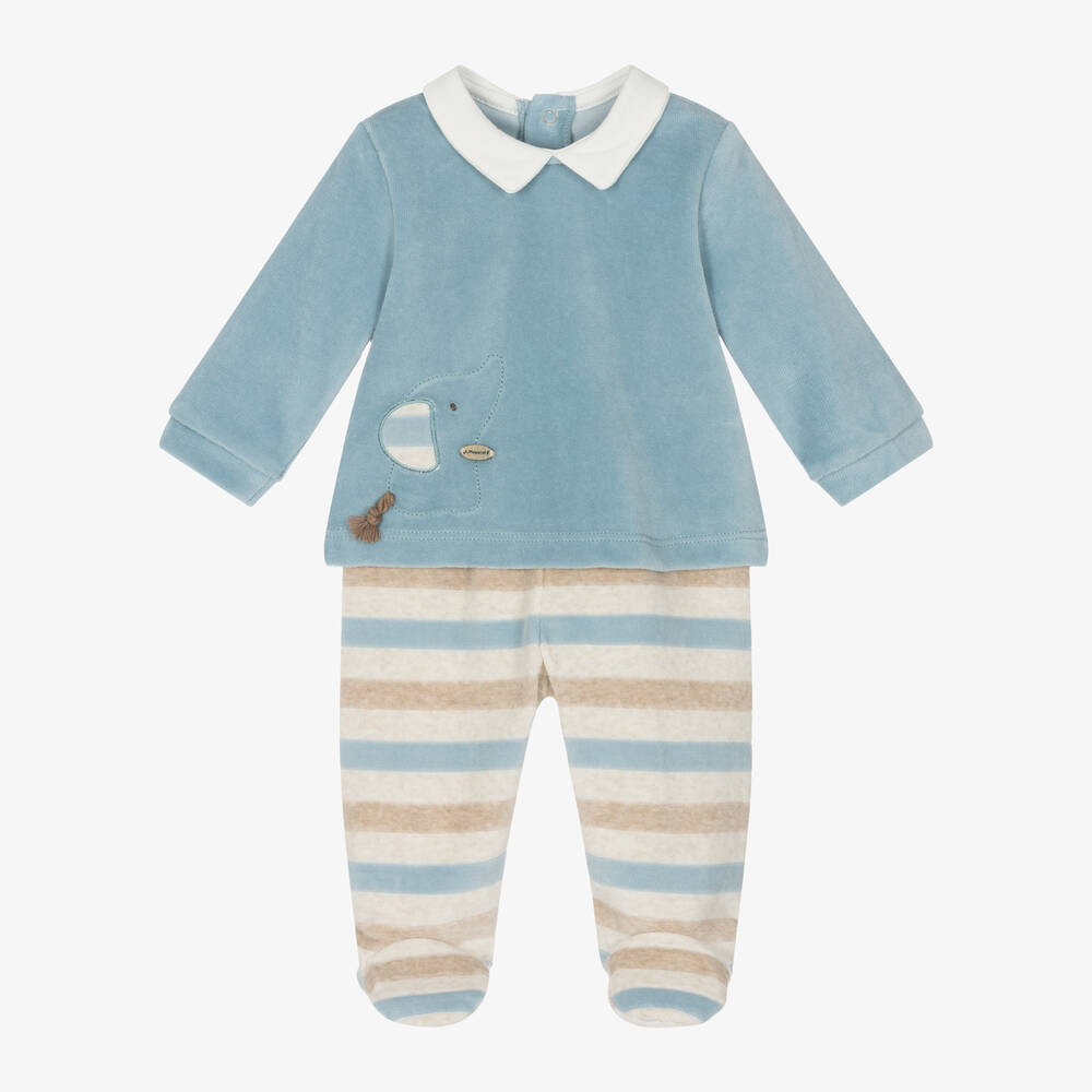 Blue two piece babygrow for boys by Mayoral, made in soft and cosy cotton velour. Trimmed with a white pointed collar, the top has a sweet elephant motif on the front and easy-fastening poppers on the back. The trousers are patterned in blue and beige stripes, with a gently elasticated waist for a comfortable fit.