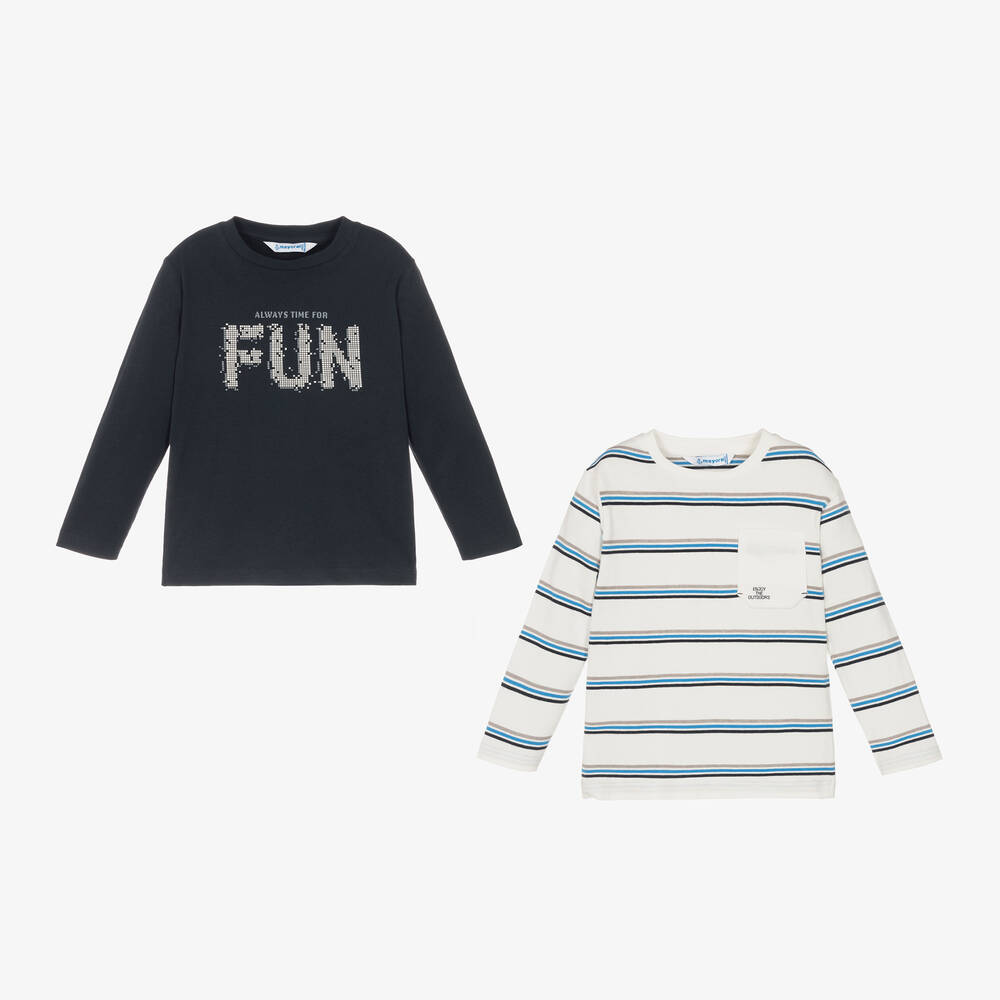 Pack of two tops for boys by Mayoral, made in soft and comfortable cotton jersey. One is patterned in grey and blue stripes, whilst the other has a 'Always time for fun' slogan printed on the front.
