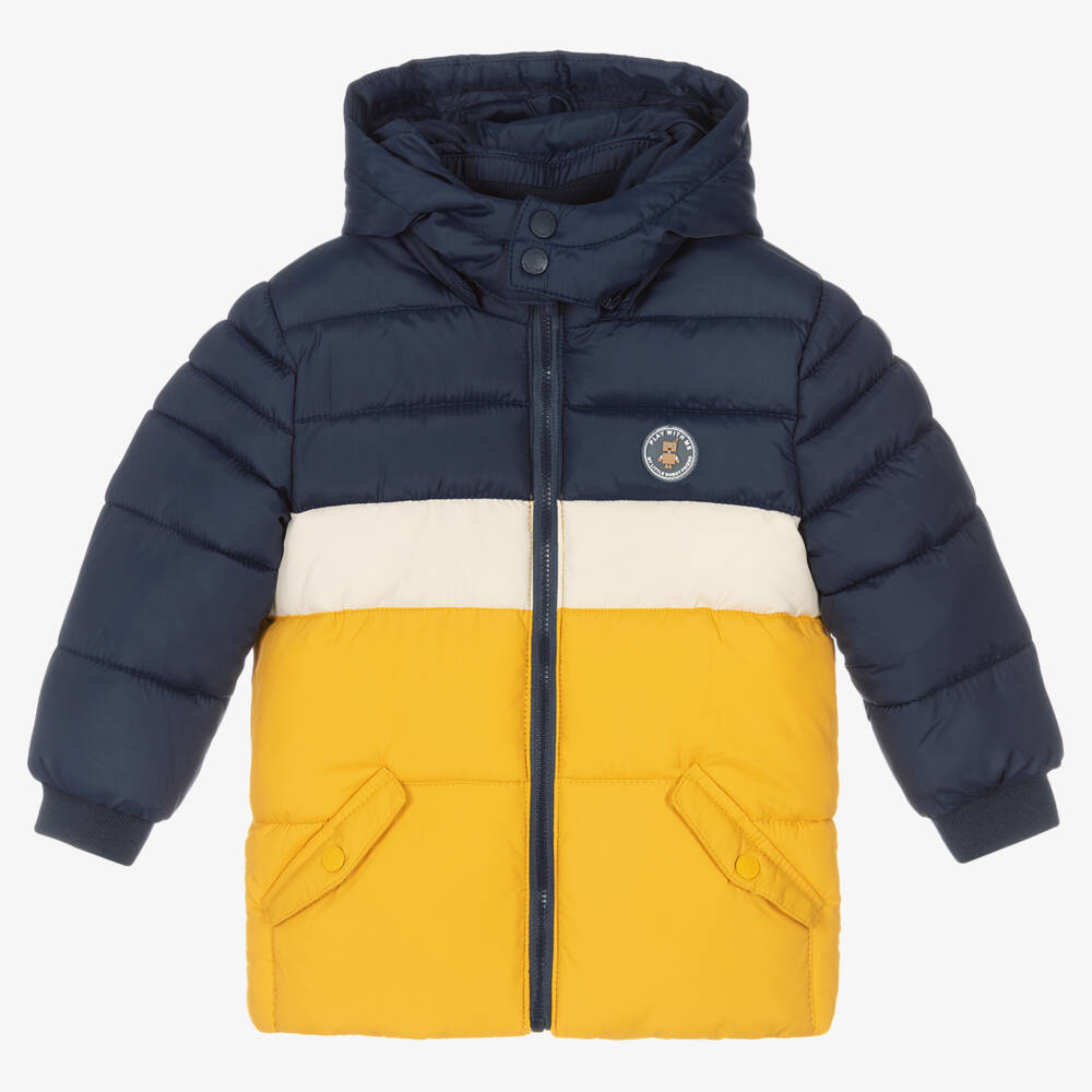 Colourblock puffer coat for little boys by Mayoral, in navy blue, ivory and yellow. Silky smooth on the outside, it is lined in cosy fleece and warmly padded for those colder months. Practical and water repellent, it has a detachable hood, a branded zip fastening, and a rubberised logo badge on the chest. There are internal ribbed cuffs to keep out chilly winds, and useful pockets on the front.
