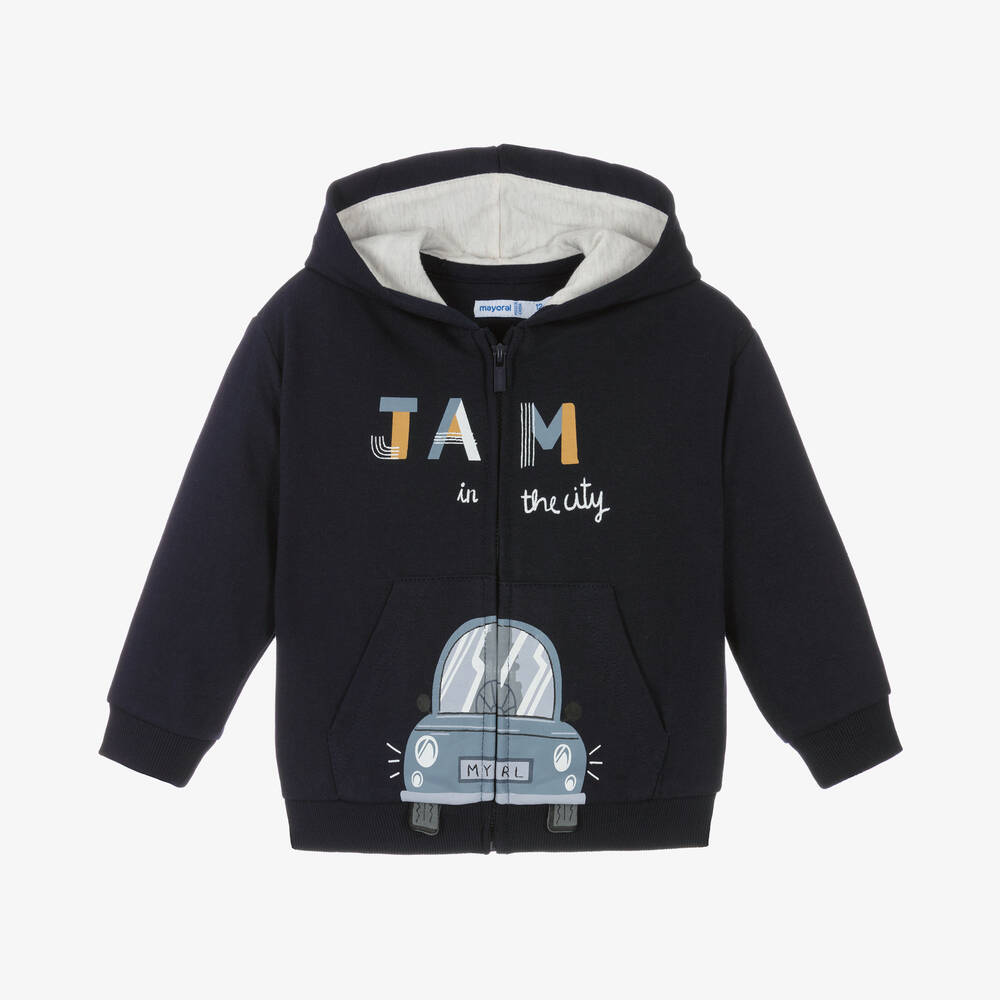 Casual zip-up top for little boys by Mayoral, in navy blue. Made in soft cotton-blend jersey, it has a fixed hood lined in contrasting beige marl, with ribbed trims for added cosiness. The words 'Jam in the city' are printed in beige and blue on the front, with a fun car print on the pouch pockets.