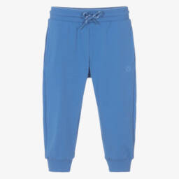 These bright blue joggers for little boys by Mayoral are a comfortable choice for casual wear. Made in soft cotton blend jersey, they have useful side seam pockets and an elasticated waist with a drawstring for a great fit. A small tonal logo adds a touch of branding.