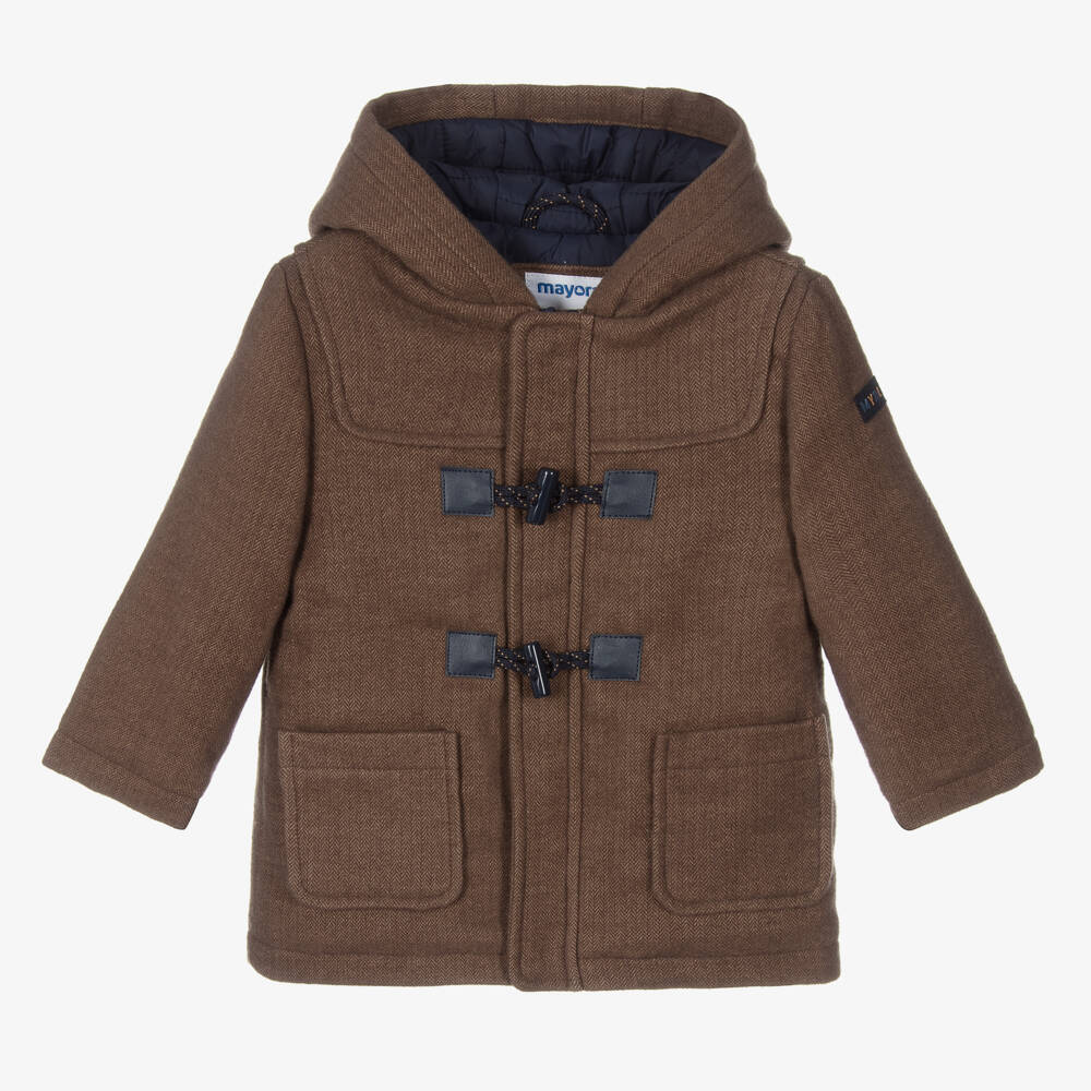 Little boys brown herringbone duffle coat by Mayoral, made in mid-weight flannel. It has all the traditional features of a duffle coat, including the toggle fastenings with a zip beneath. There is a navy blue rubber logo patches on one sleeve. It has a silky navy blue nylon lining and lightweight polyester padding for added warmth.