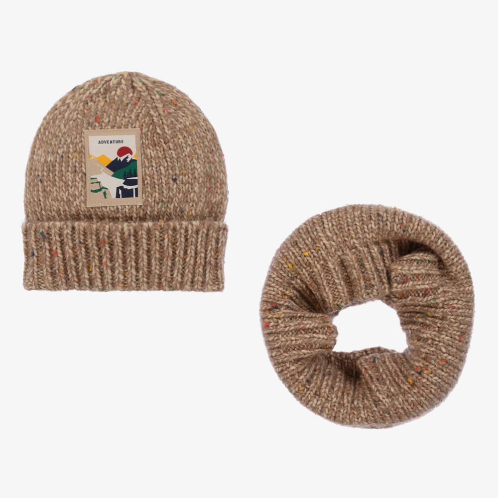 Brown with multicolour flecks, this knitted hat and snood set for boys is by Mayoral. The beanie has a colourful adventure patch on the front, depicting a mountain range. Ideal for colder days, the cosy snood completes the coordinated set.