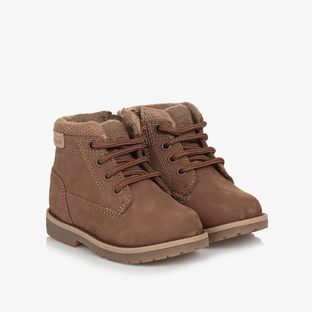 Sturdy brown leather boots for little boys by Spanish brand Mayoral, fastening with laces on top and a zip on the sides with a velcro strap. They have a cosy wool lining, with a cushioned leather insole for comfort and a rugged, non-slip tread on the rubber soles.