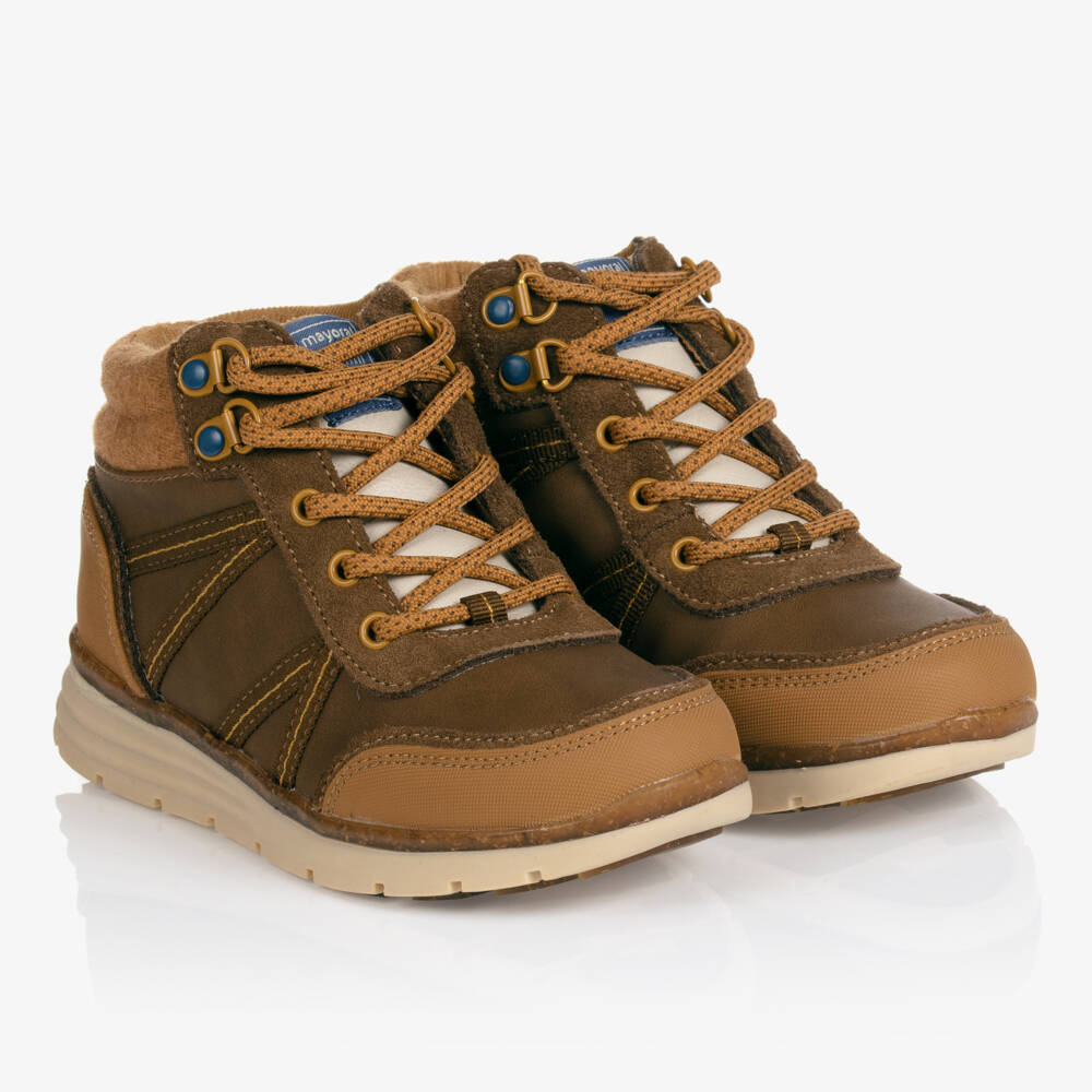 Brown boots for boys by Mayoral, made in soft suede leather. Lined in soft beige corduroy, they have padded ankles and a cushioned insole for a comfortable fit. There are blue logo badges on the tongue and blue shapes on the back of the heel. Fastening with laces, they have chunky rubberised non-slip for good grip.