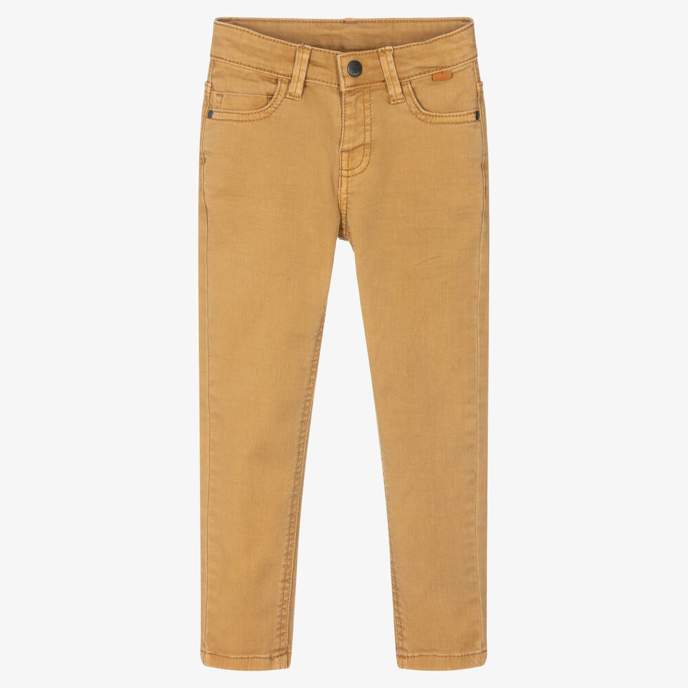 Boys camel brown sustainable denim jeans from Mayoral, in a stylish skinny fit. Easy to pair with just about anything, these staple jeans come in a five pocket style and have a light tan brown logo patch on the back. An adjustable waist allows room to grow, whilst the single popper fastens easily.
