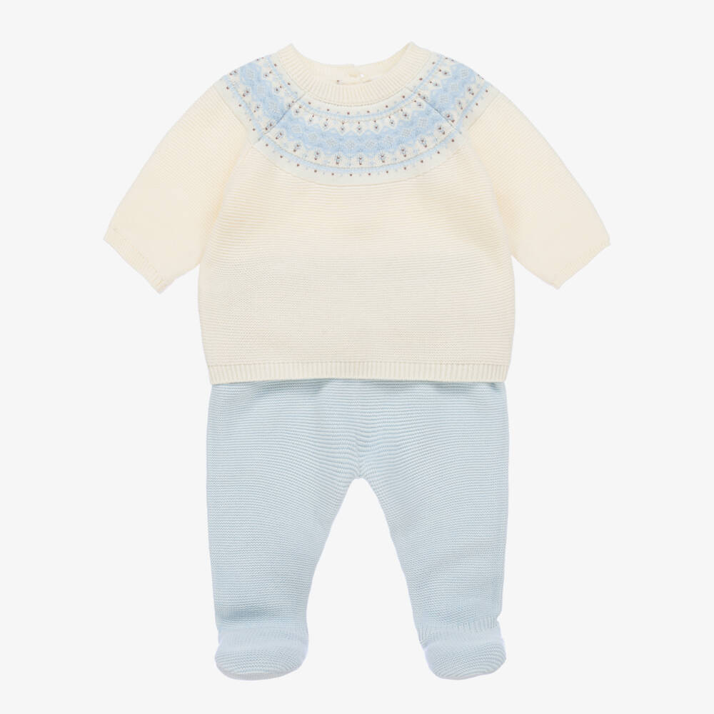 Adorable two-piece babygrow for boys from Mayoral, knitted in soft cotton. Lightweight yet cosy, the ivory crew neck top has a lovely blue Fair Isle pattern and button fastenings on the back. It pairs with pale blue striped bottoms that have a gently elasticated waistband for comfortable wear.