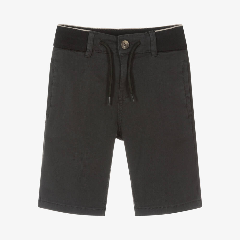 In dark grey, these sustainable cotton Bermuda shorts for boys are by Mayoral Nukutavake. Made in stretchy mid-weight piqué, they have a black ribbed drawstring waist for a comfortable fit, with a button and zip fastening. There are useful pockets on the side seams and buttoned flap pockets on the back.