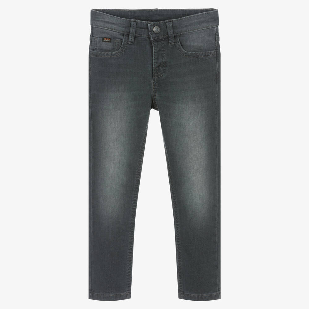 Faded dark grey washed jeans for boys by Mayoral, made from sustainable cotton denim in a slim fit. With a slight stretch and soft looped underside for a comfortable wear, they also have an adjustable waistband for a good fit. They have a five-pocket styling, a logo embossed patch and popper fastening on the front with additional zip on larger sizes.