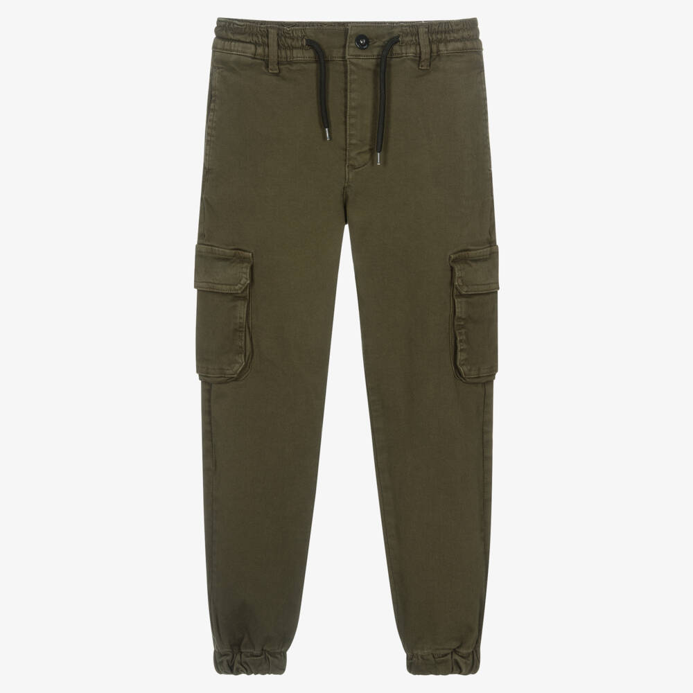 Casual dark khaki green cargo trousers for older boys from Mayoral Nukutavake. Made in stretchy cotton twill, they come in a jogger style with elasticated cuffs and have large utility pockets on the sides of the legs. Fastening with a zip and button, they have an elasticated waist with a drawstring tie and belt loops for an adjustable fit. There are concealed pockets on the front and a single pocket on the back with a popper-fastening flap.