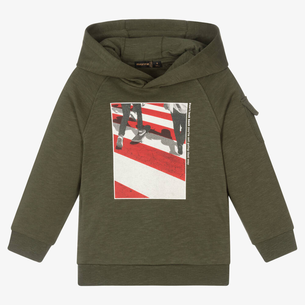 Green hoodie for boys by Mayoral, made in soft sustainable cotton sweatshirt jersey, with a fleecy inside. Comfortable and cosy, it has a skateboard-themed print on the front in white and red. There are useful pockets on the side seams and a patch pocket with velcro closure on one sleeve.
