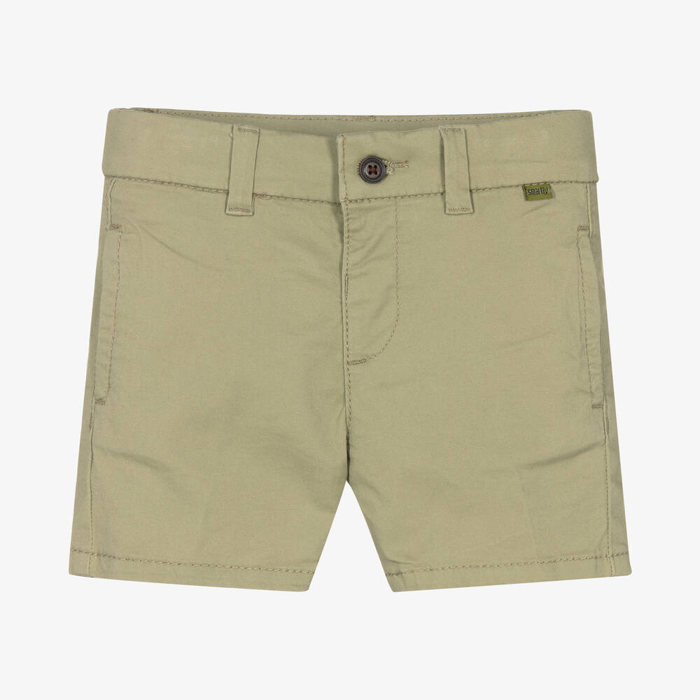 Casual khaki green shorts for little boys by Spanish brand Mayoral, made in sustainable cotton. They have a button fastening, and an adjustable waist for a great fit, with concealed side pockets and buttoned back pockets.