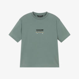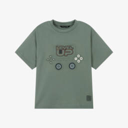 Sage green cotton T-shirt for older boys by Mayoral Nukutavake, with a skateboard print in shades of black, green and orange on both the front and back. Made in soft comfortable jersey, it has a relaxed fit and is ideal for casual wear.