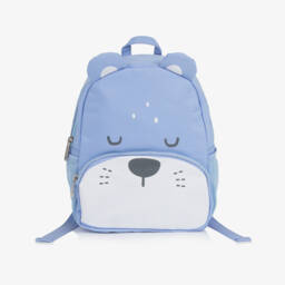A cute dinosaur-themed backpack in shades of green for boys by Mayoral, with 3D spikes and tail. Made in sturdy canvas, it has a zipped compartment, three exterior pockets and an ID sleeve. The blue straps are padded and adjustable for a good fit.