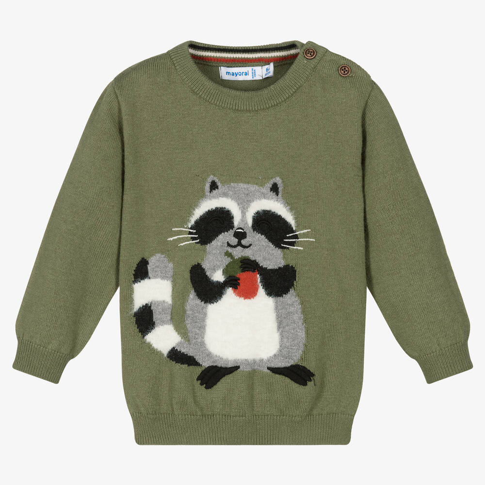 Khaki green sweater for little boys by Mayoral, finely knitted in a soft cotton and wool blend. It has a cute jacquard raccoon and acorn design with soft, fluffy details. There are branded button fastenings on one shoulder.