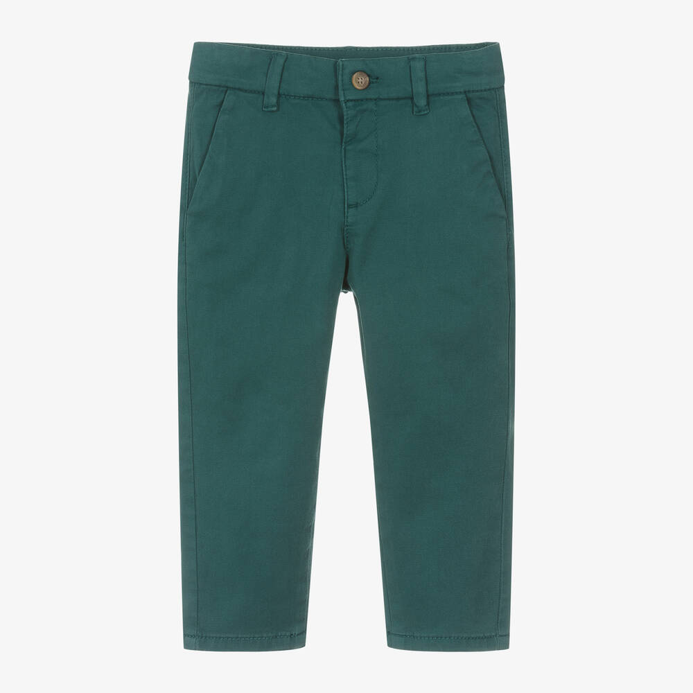 Dark green cotton twill chino trousers for little boys by Spanish brand Mayoral, ideal for smart-casual wear. Slightly stretchy with an adjustable waistband, these slim-fitting trousers fasten on the front with a button. There are slanted front pockets and faux back pockets with decorative button detail.