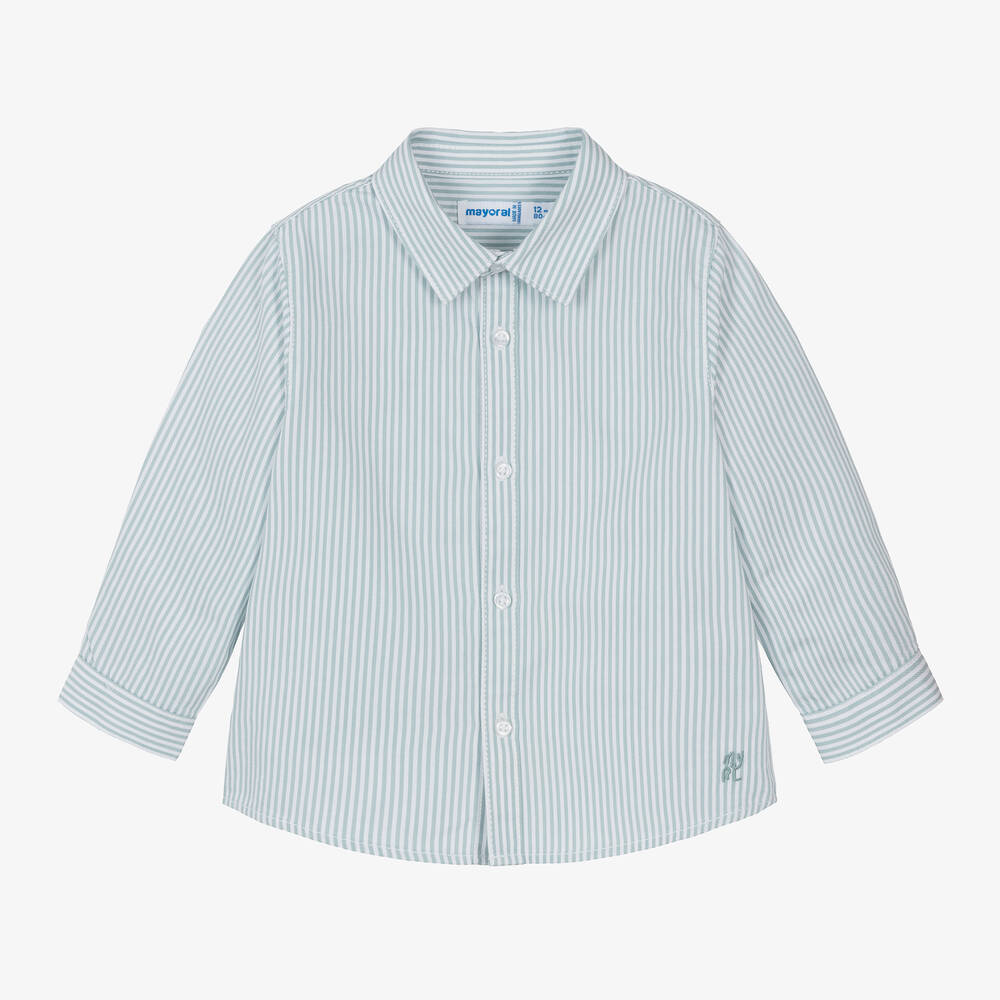 Striped in green and white, this Mayoral shirt for little boys is made in soft cotton twill. It is long-sleeved and fastens with branded buttons on the front and cuffs. A discreet embroidered logo on the hem adds a subtle designer touch.