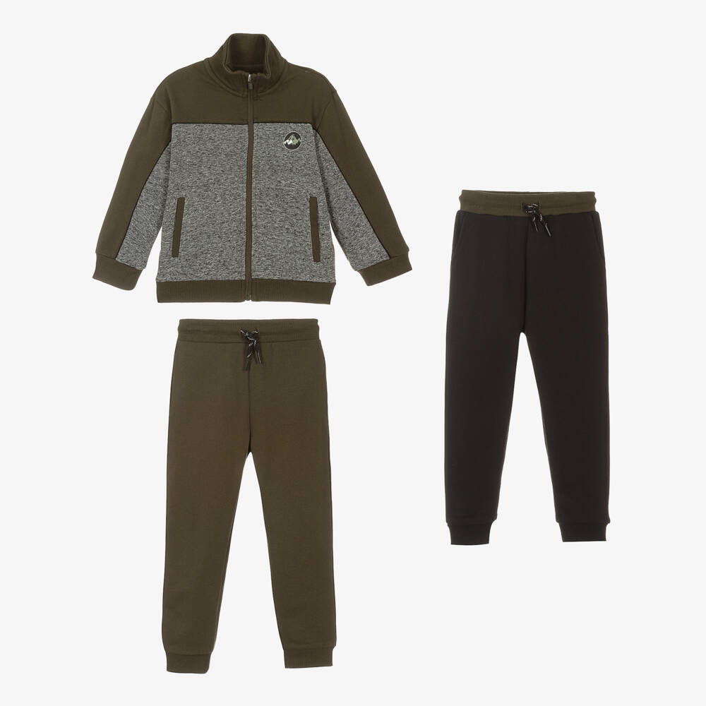 Boys khaki green three-piece tracksuit set from Mayoral, made in soft sweatshirt jersey with a fleecy underside. The zip-up top has grey marled panelling, two front pockets and a mountain badge printed on the chest. The khaki green joggers have black trims and the other pair is black with a green waistband and slogan print on the back. Both pairs have ribbed cuffs, drawstring waistbands, extra durable knees and pockets.