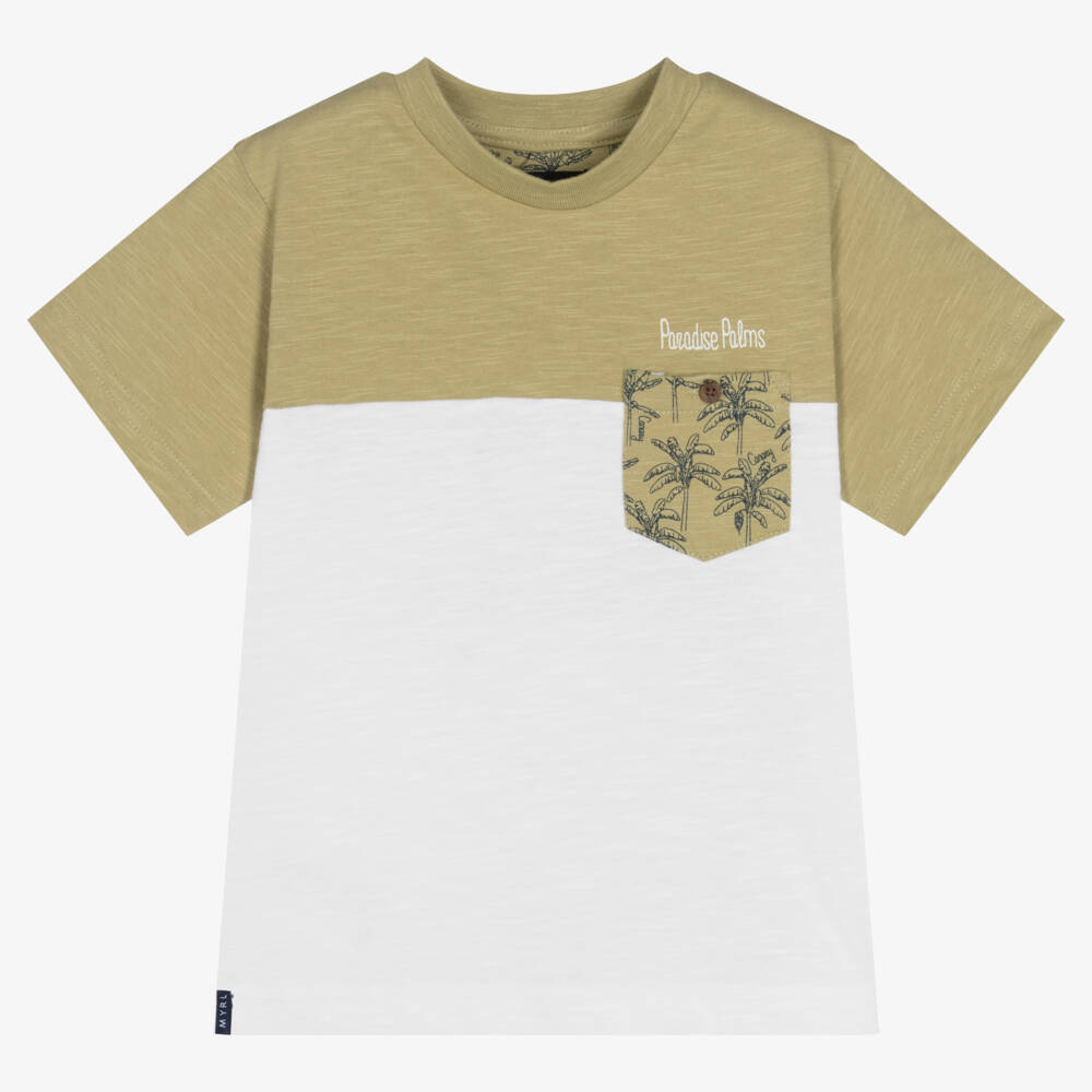 Green and white colourblock T-shirt for boys by Spanish brand Mayoral, made in comfortable cotton slub jersey. It has a useful chest pocket with a blue palm tree print and a 'Paradise Palms' slogan printed above in white. This item is made with 100% sustainable cotton.