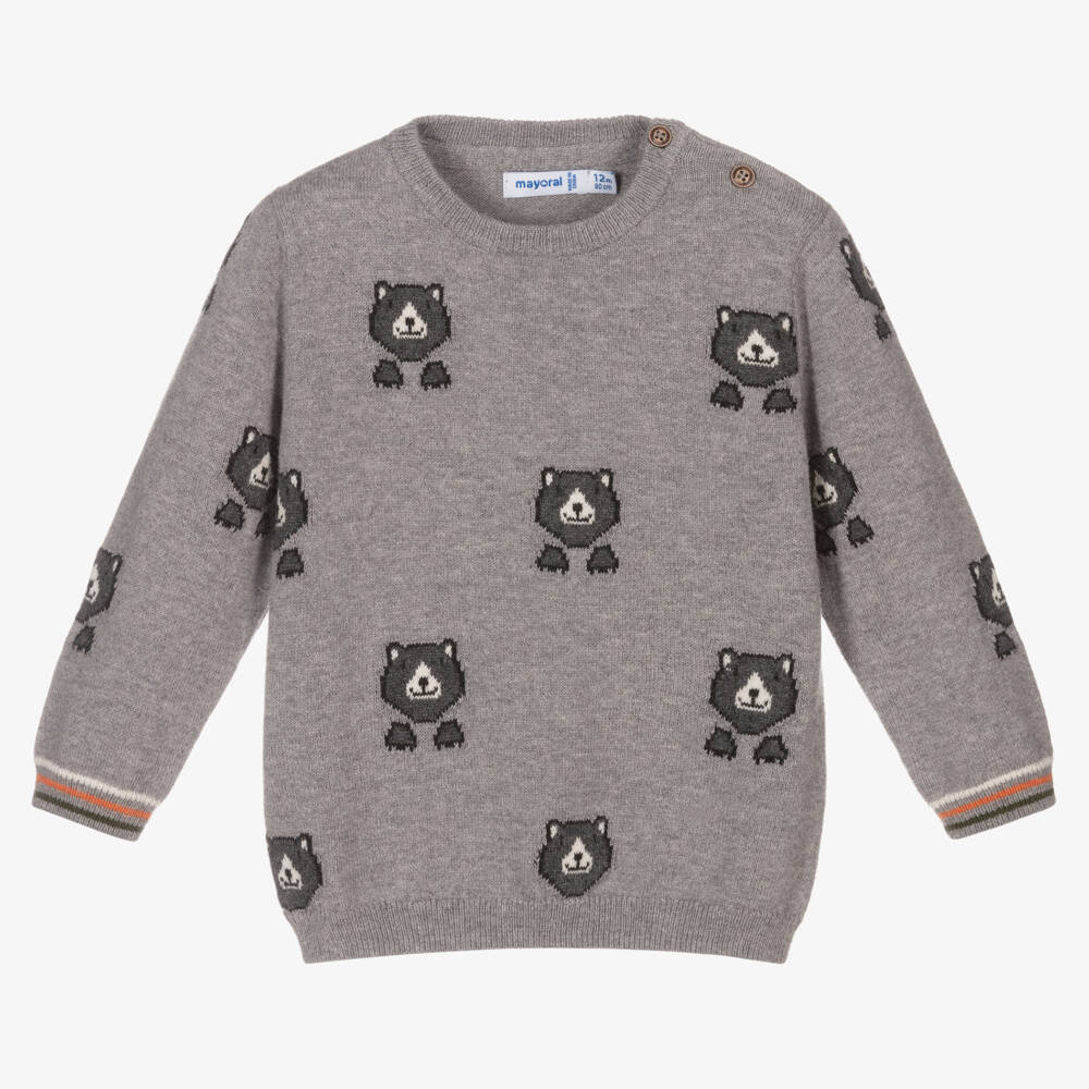 Little boys grey sweater from Mayoral. Made in a soft cotton and wool blend, this comfortable knitted jumper has a cute jacquard bear design and ivory, orange and green striped sleeve cuffs. There are button fastenings on one shoulder for easy dressing.