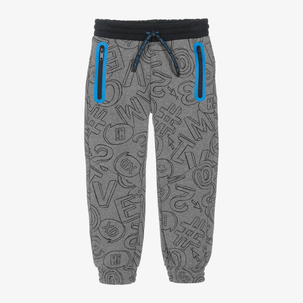 Grey marl joggers for boys by Mayoral, made in soft cotton blend sweatshirt jersey. This sporty design features elasticated ankle cuffs, zipped pockets with bright blue, rubberised trims and reinforced knees for extra durability. The elasticated waistband has a drawstring for the ideal fit, which is printed with positive slogans.
