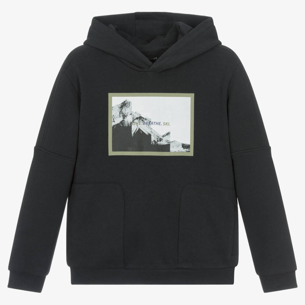 Cool charcoal grey hoodie for older boys by Mayoral Nukutavake, with a ski-inspired print on the front. Made in soft cotton jersey with a fleecy underside and ribbed trims, it is designed in an oversized fit with two patched hand pockets on the side seams.