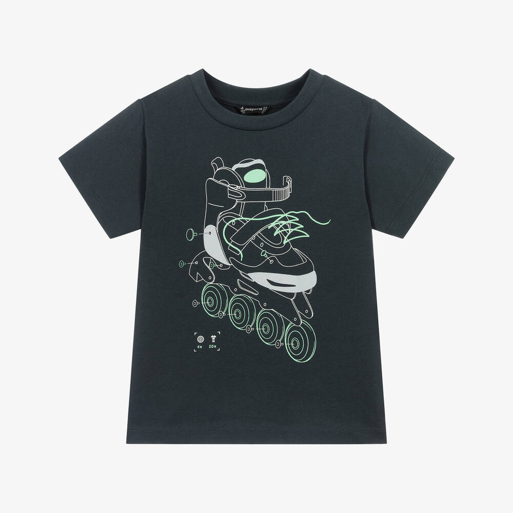 Boys dark grey T-shirt by Mayoral, made in soft and comfortable cotton jersey. This casual tee features a fun a glow-in-the-dark roller skate illustration on the front.