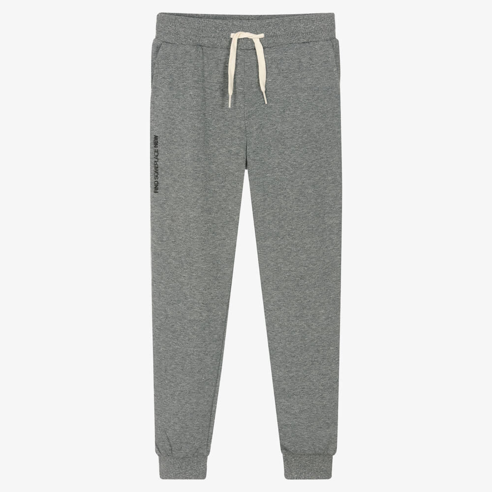 Comfortable marl grey joggers for boys by Mayoral, made in soft cotton-blend jersey. They have an elasticated waistband with a drawstring tie for an adjustable fit, three pockets and 'Find some place new' in raised tonal print on one leg.
