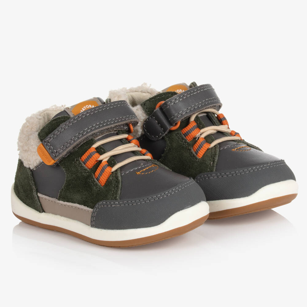 Little boys grey trainers from Mayoral, with green details. The uppers are made in smooth leather and soft suede with a fluffy faux shearling ankle panel. Lined with beautifully soft leather, they have removable, antibacterial and ergonomic insoles for added comfort. Elasticated laces and a velcro strap ensure ease of dressing. Providing support, the heel and toes are reinforced and the soles have non-slip treads. These shoes are made with sustainable tanned leather.