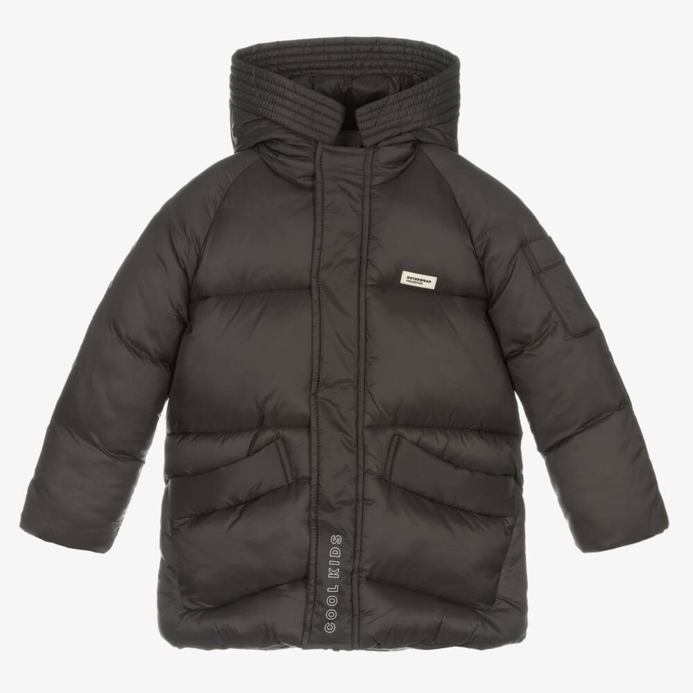Boys grey puffer coat by Mayoral. Thickly padded for warmth, it has a fixed hood and a zip and popper flap fastening. There are handwarmer pockets and a pocket on one sleeve, with side zips for ease of movement. There is a soft fleece lining and a name tag.